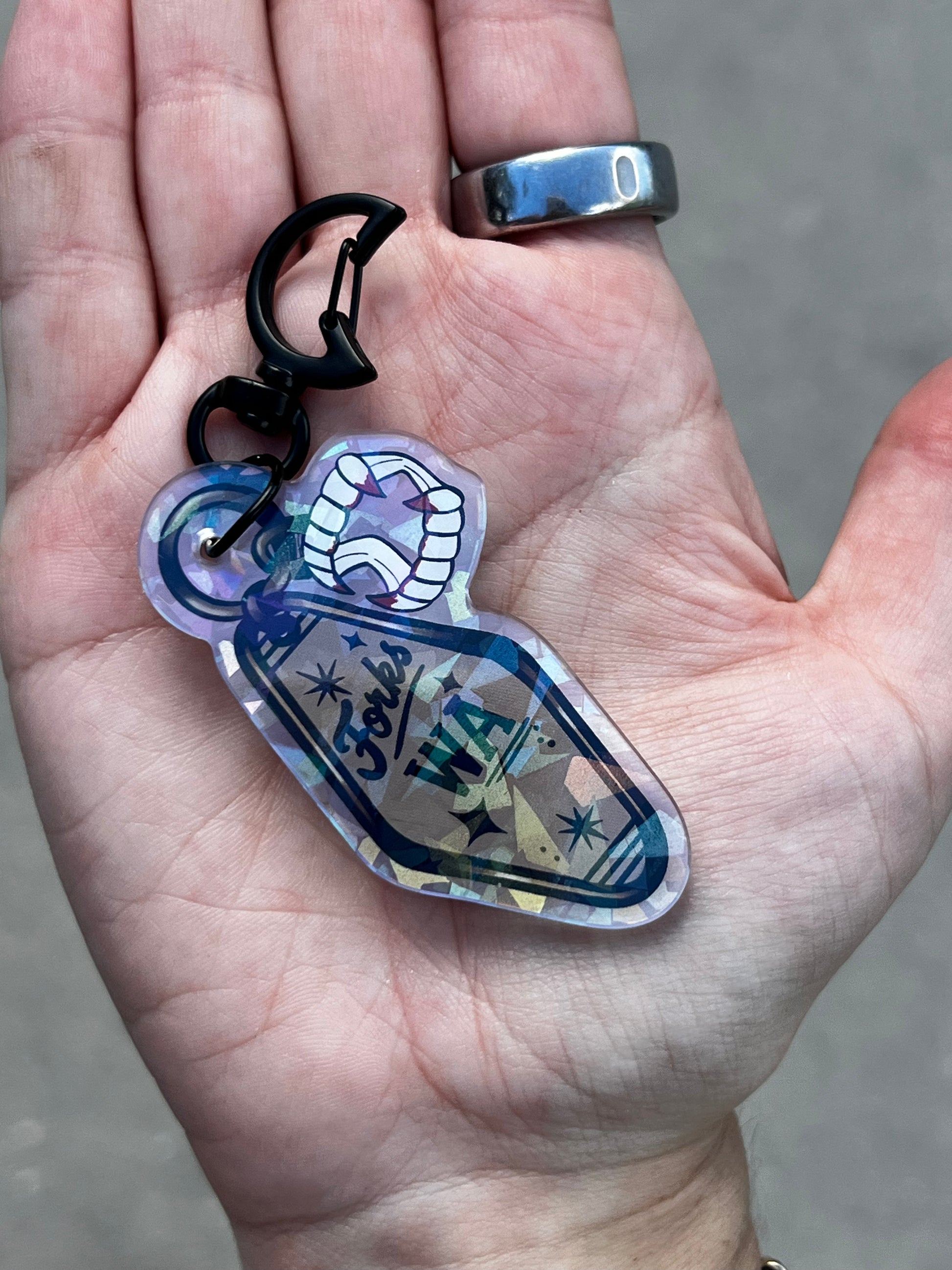 This keychain is double-sided and features a rainbow holographic overlay with a matching black chain and a black moon clasp.